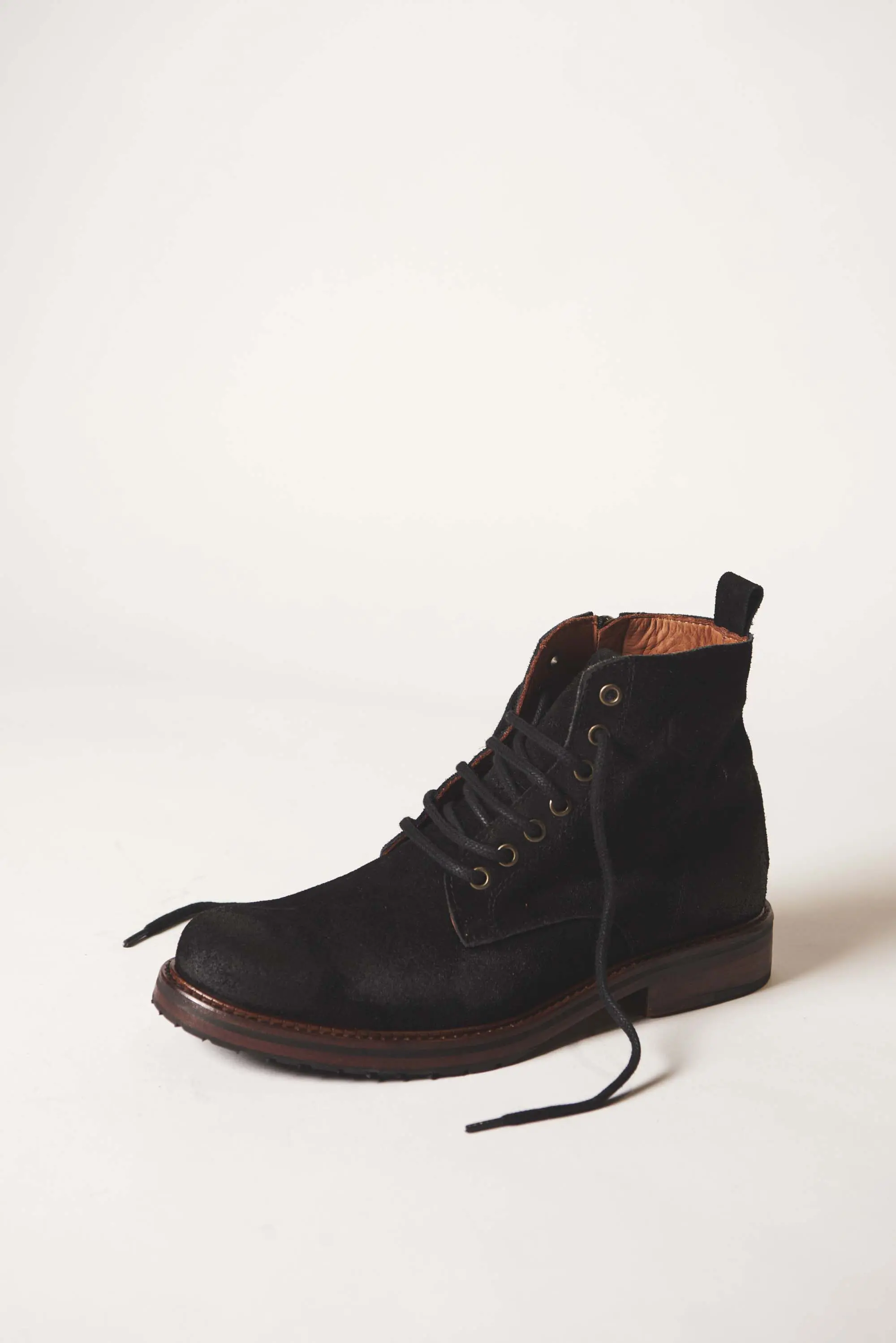 Borcego de caña alta en cuero descarne gamuzado con cierre lateral de metal bronce empavonado y lustrados artesanales localizados. Cordones tubulares al tono y ojales de metal al tono del cierre. Logo de marca grabado en bajo relieve en cara externa y lengüeta. Suela en cuero vacuno con caucho antideslizante.