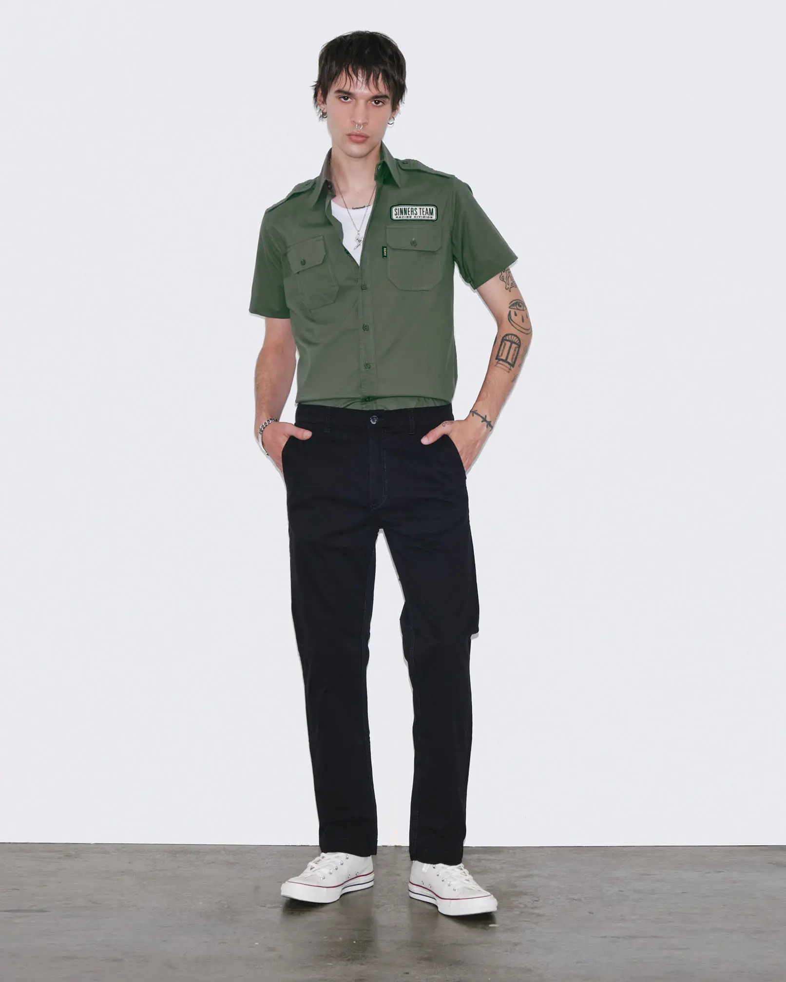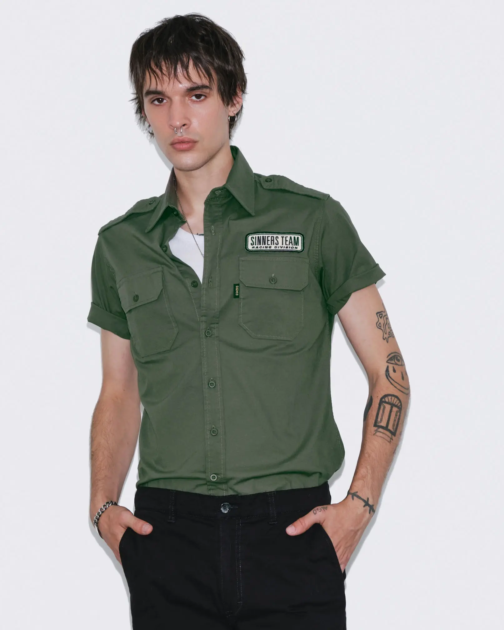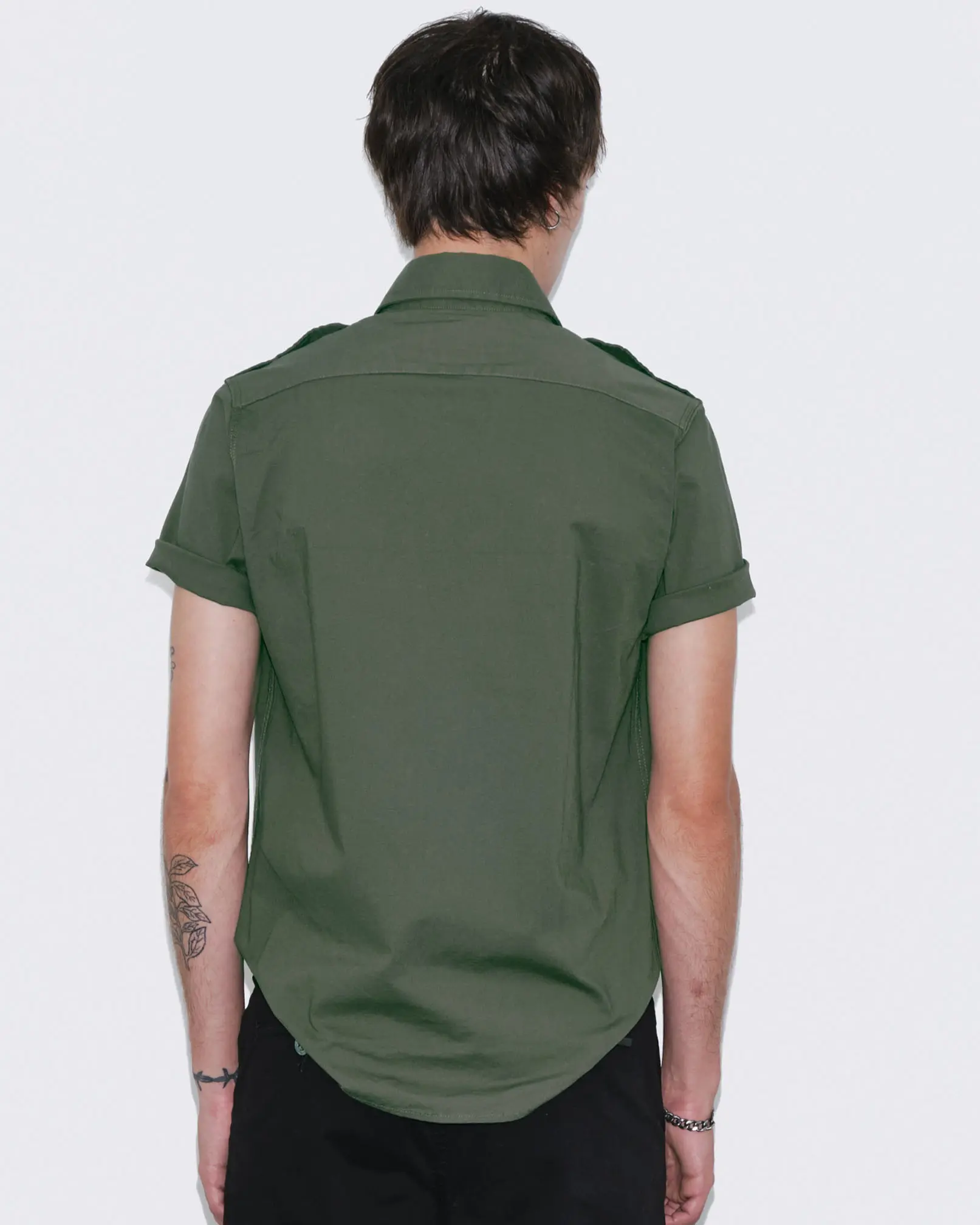 Camisa confeccionada en gabardina de algodón. Bolsillos plaqué con tapa y presilla interna en mangas para acortar. Botones marcarios.