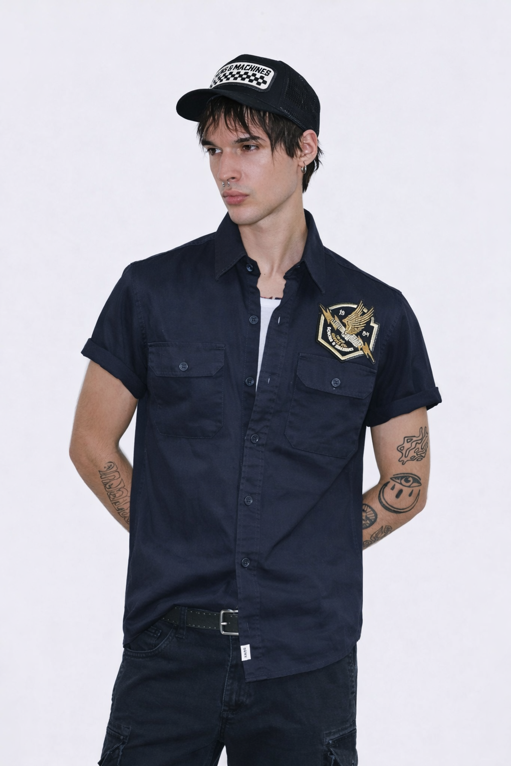Camisa confeccionada en gabardina de algodón. Bolsillos plaqué con tapa y presilla interna en mangas para acortar. Botones marcarios.
