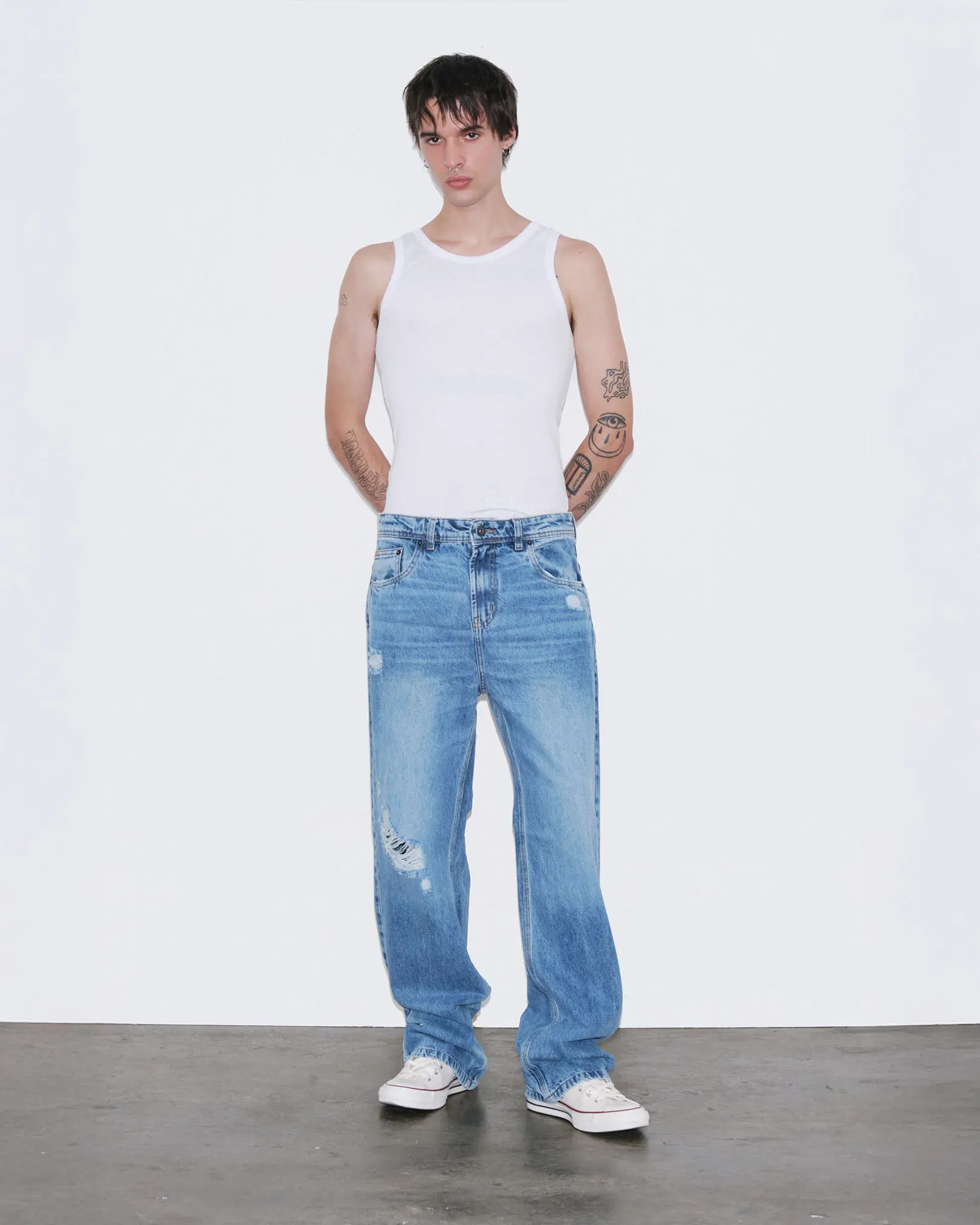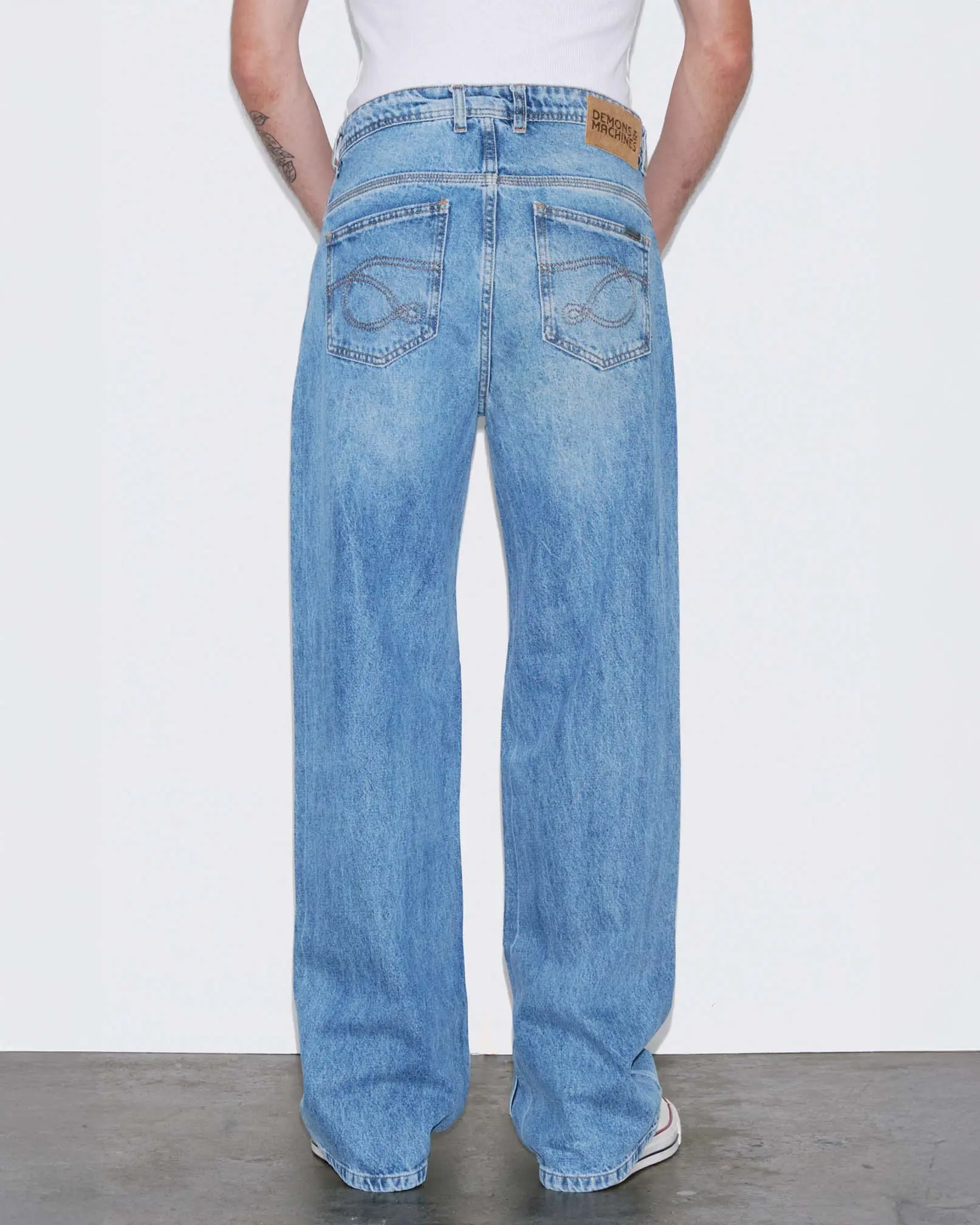 DENZEL es nuestro jean de calce relaxed confeccionado en denim rígido. Este fit se caracteriza por su corte relajado, de tiro medio-bajo cae con gran amplitud desde la parte trasera hacia las piernas, terminando en una botamanga bien ancha, logrando comodidad y libertad de movimiento. Lavado destroyed en tono celeste con reservas de color azul original y roturas localizadas a lo largo del frente.