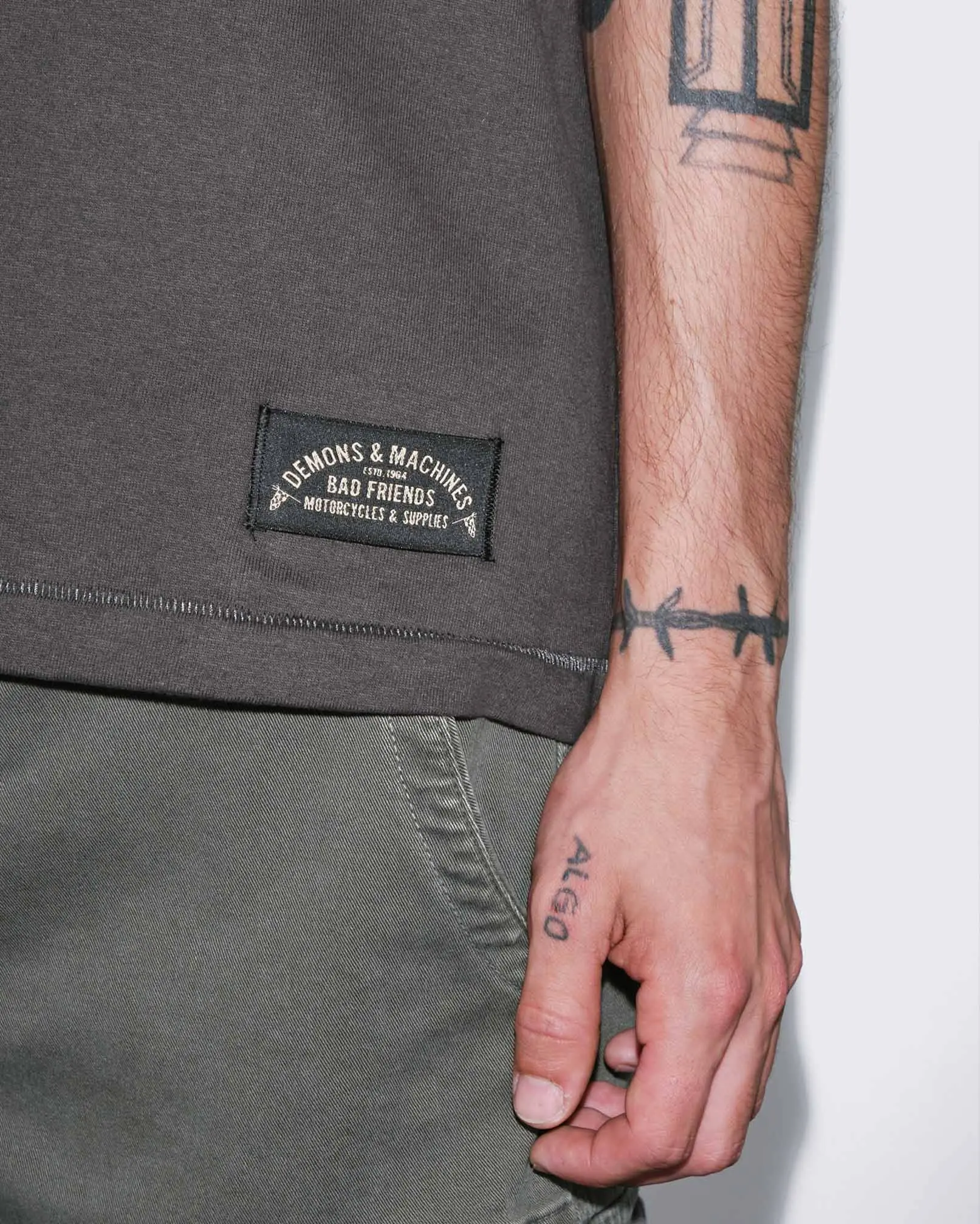 Remera manga corta confeccionada en Jersey 16/1 de algodón peinado. Calce slim y cuello terminado en collareta con complemento ribb. Bolsillo plaqué al frente. Terminaciones de mangas y ruedo en dobladillo con costura india. Suavizado sobre prenda terminada. Estampa al frente y en espalda en técnica serigrafía con relieve engomado. Composición: 100% Algodón