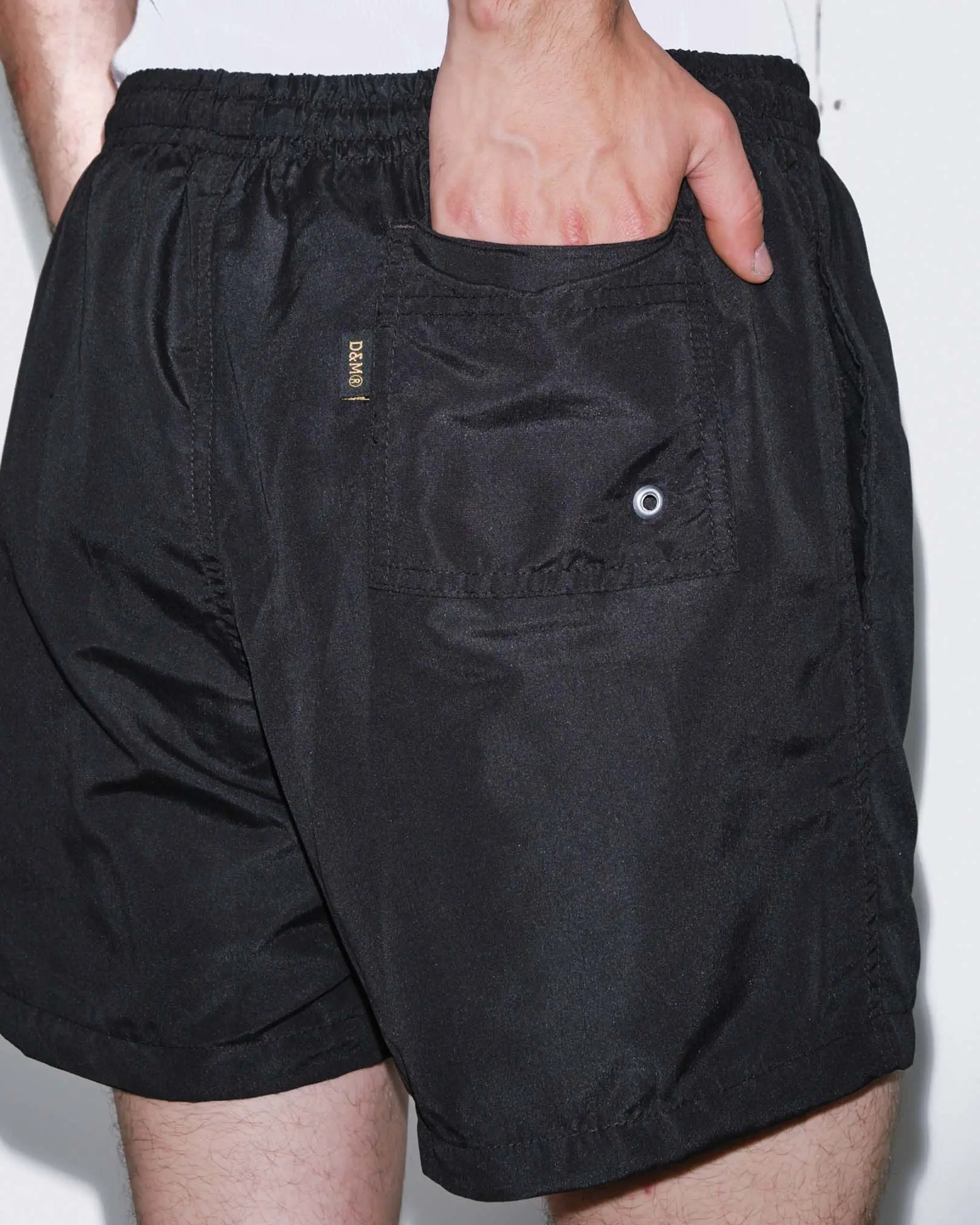 Short de baño confeccionado en microfibra, con interno de red. Cintura ajustable con elástico interno y cordón con puntera. Logo de marca bordado al frente en hilo negro.