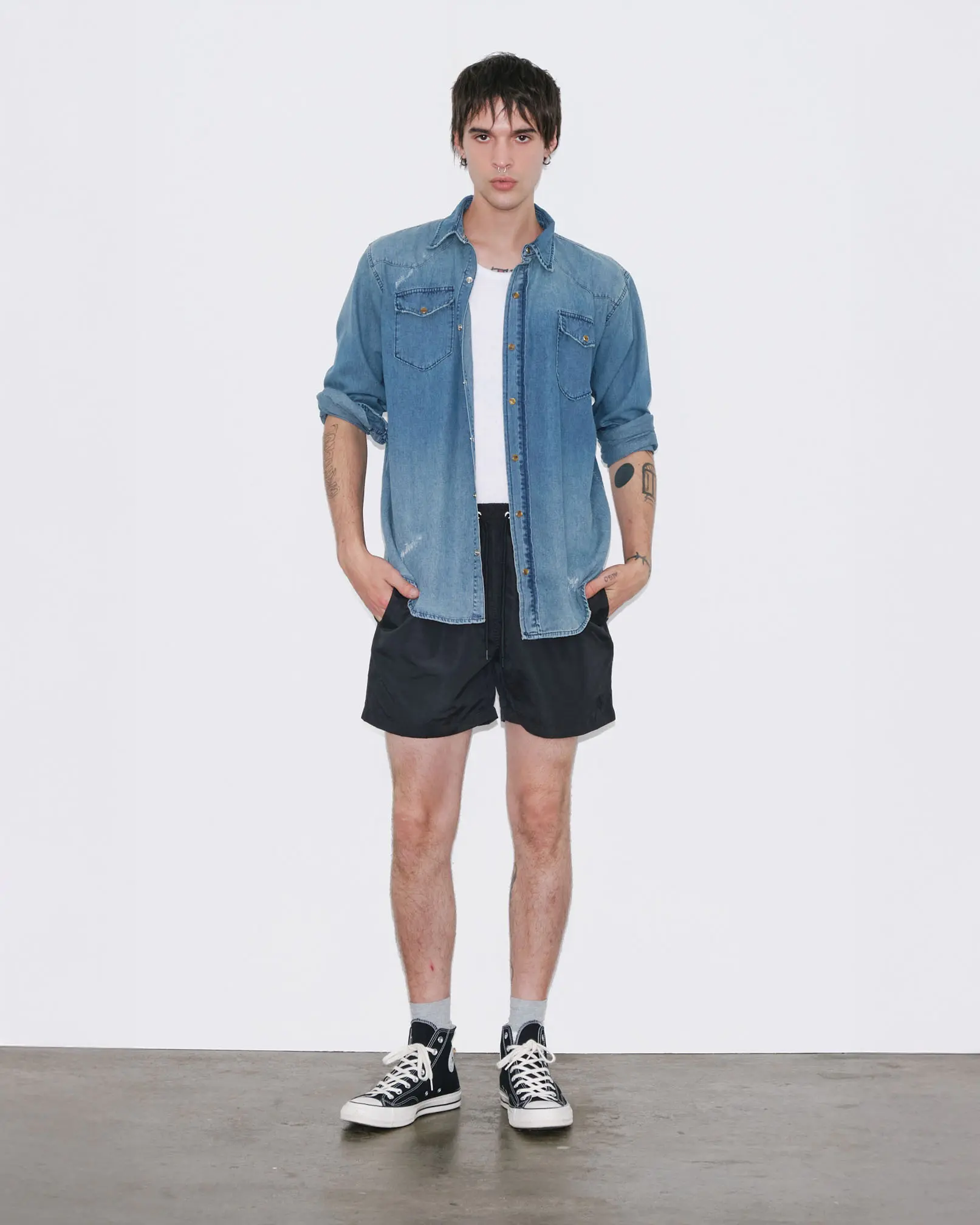 Short de baño confeccionado en microfibra, con interno de red. Cintura ajustable con elástico interno y cordón con puntera. Logo de marca bordado al frente en hilo negro.