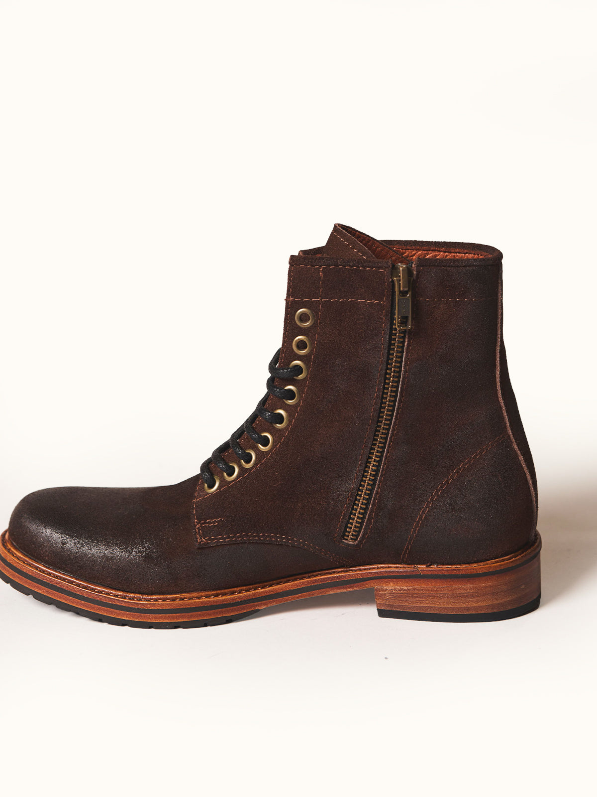 Borcego de caña alta en cuero descarne gamuzado con cierre lateral de metal bronce empavonado y lustrados artesanales localizados. Cordones tubulares al tono y ojales de metal al tono del cierre. Logo de marca grabado en bajo relieve en cara externa y lengüeta. Suela en cuero vacuno con caucho antideslizante.