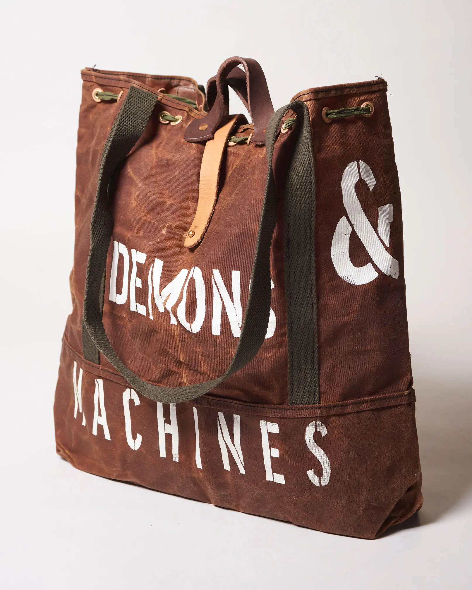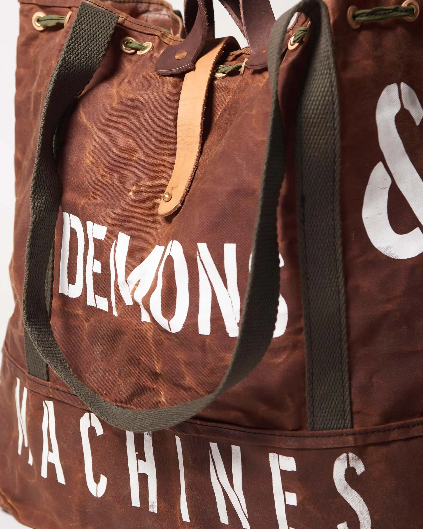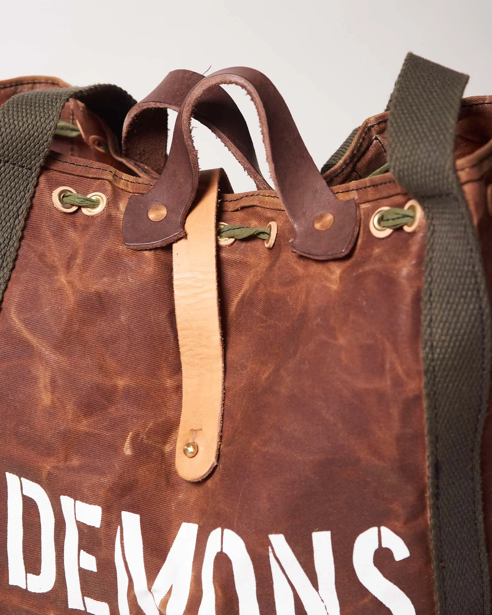 Bolso estilo militar de gabardina encerado artesanalmente logrando impermeabilizar el producto y hacerlo repelente al agua.