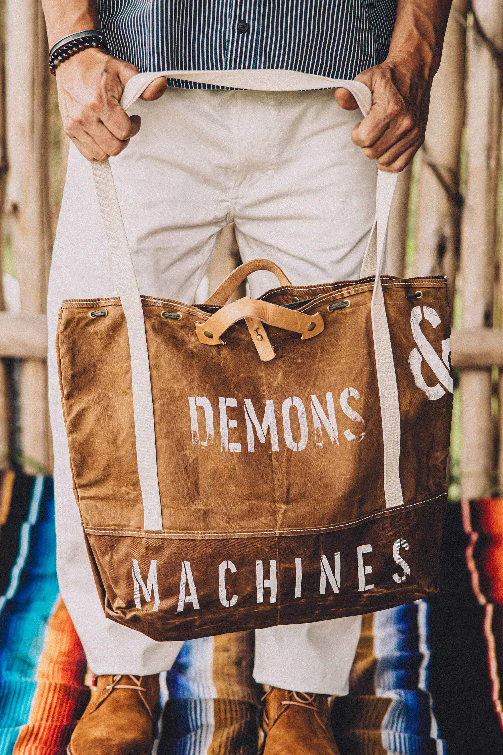 Manijas cortas de cuero remachado. Tiras largas de soga para usarlo colgado al hombro o cruzado al cuerpo.