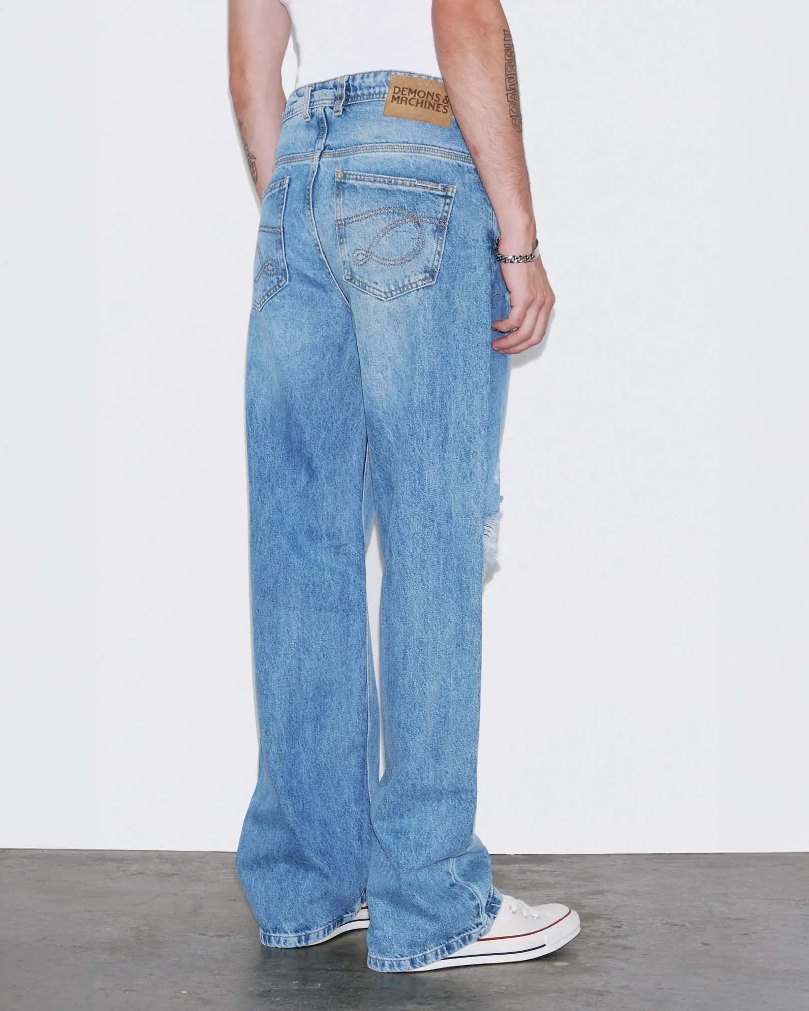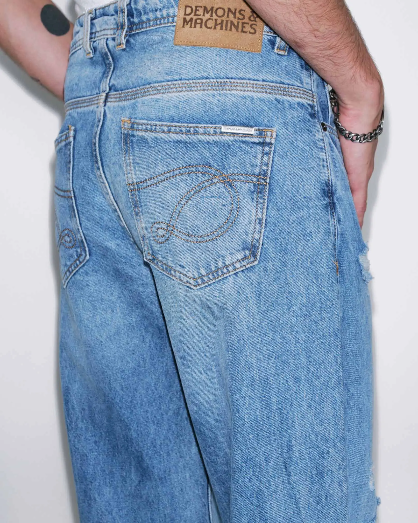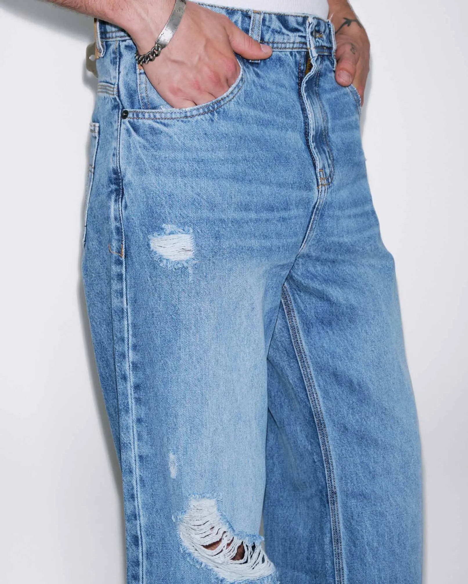 DENZEL es nuestro jean de calce relaxed confeccionado en denim rígido. Este fit se caracteriza por su corte relajado, de tiro medio-bajo cae con gran amplitud desde la parte trasera hacia las piernas, terminando en una botamanga bien ancha, logrando comodidad y libertad de movimiento. Lavado destroyed en tono celeste con reservas de color azul original y roturas localizadas a lo largo del frente.