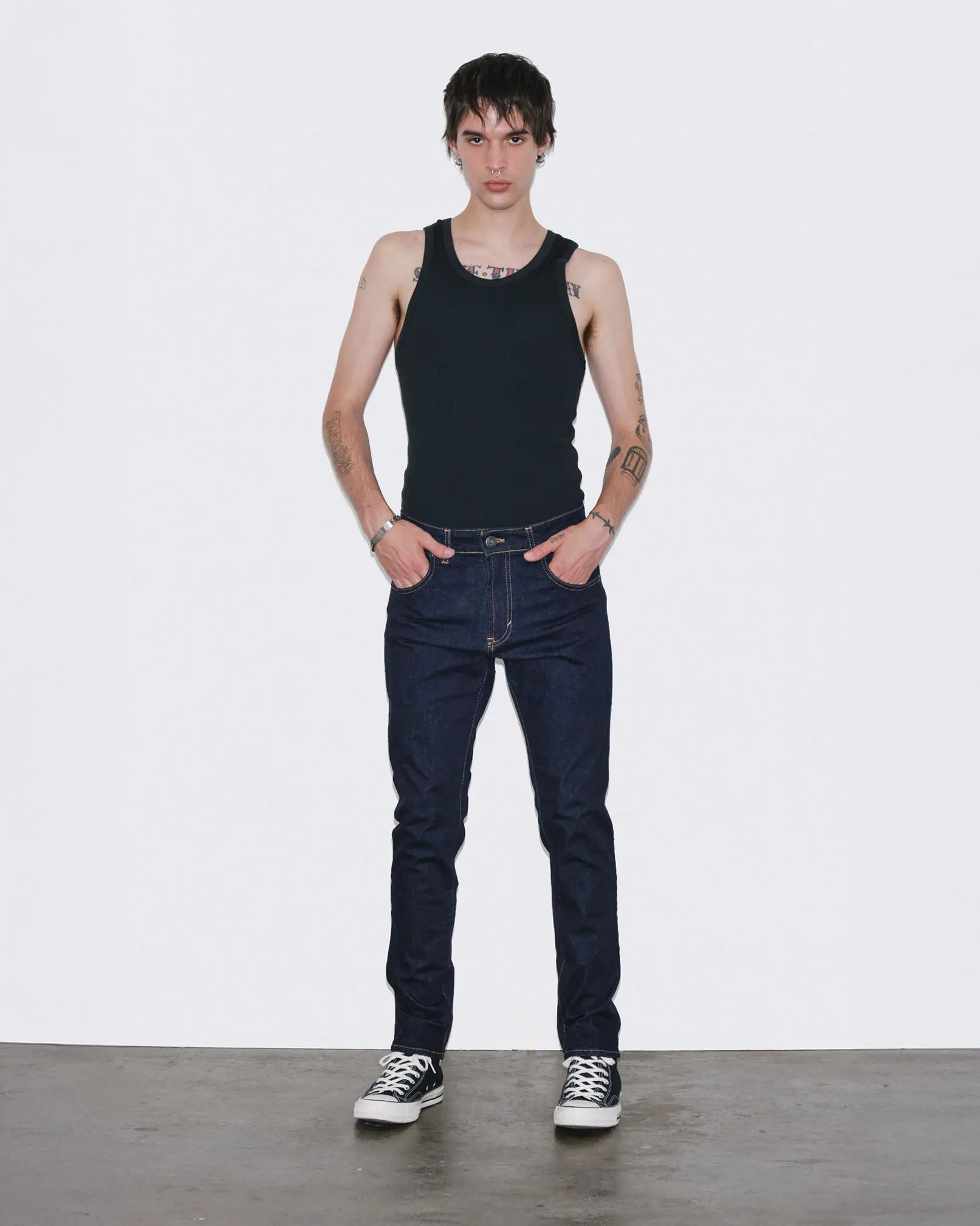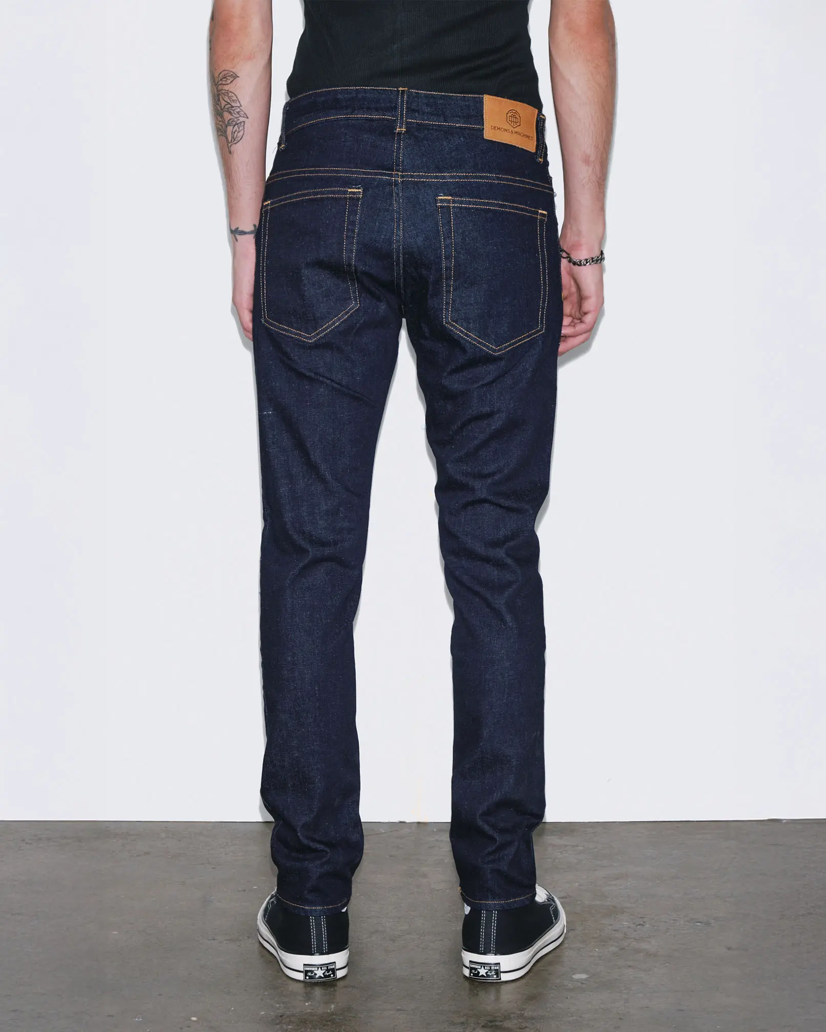 NEW JERSEY es nuestro jean de calce skinny confeccionado en denim elastizado importado de Turquía. Este fit es de tiro medio y queda entallado en piernas, acompañando el cuerpo sin pegarse excesivamente. La tela base, tejida en Turquía, es un gran diferencial en este modelo aportando comodidad, alta elasticidad y un tacto único. Su lavado raw original blue tiene una apariencia y tacto bien natural resaltando y jerarquizando la calidad del tejido, manteniendo el tono oscuro de manera uniforme.