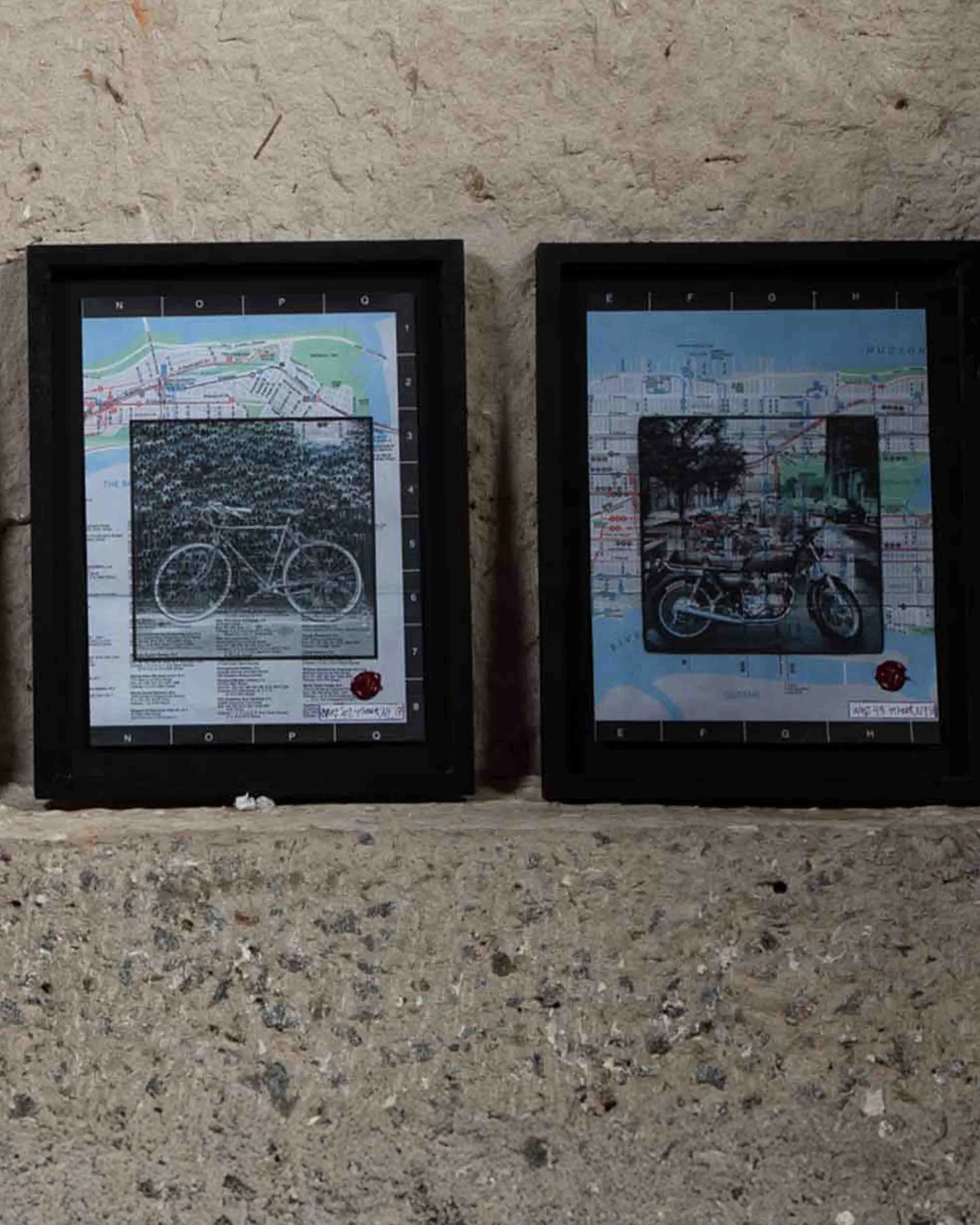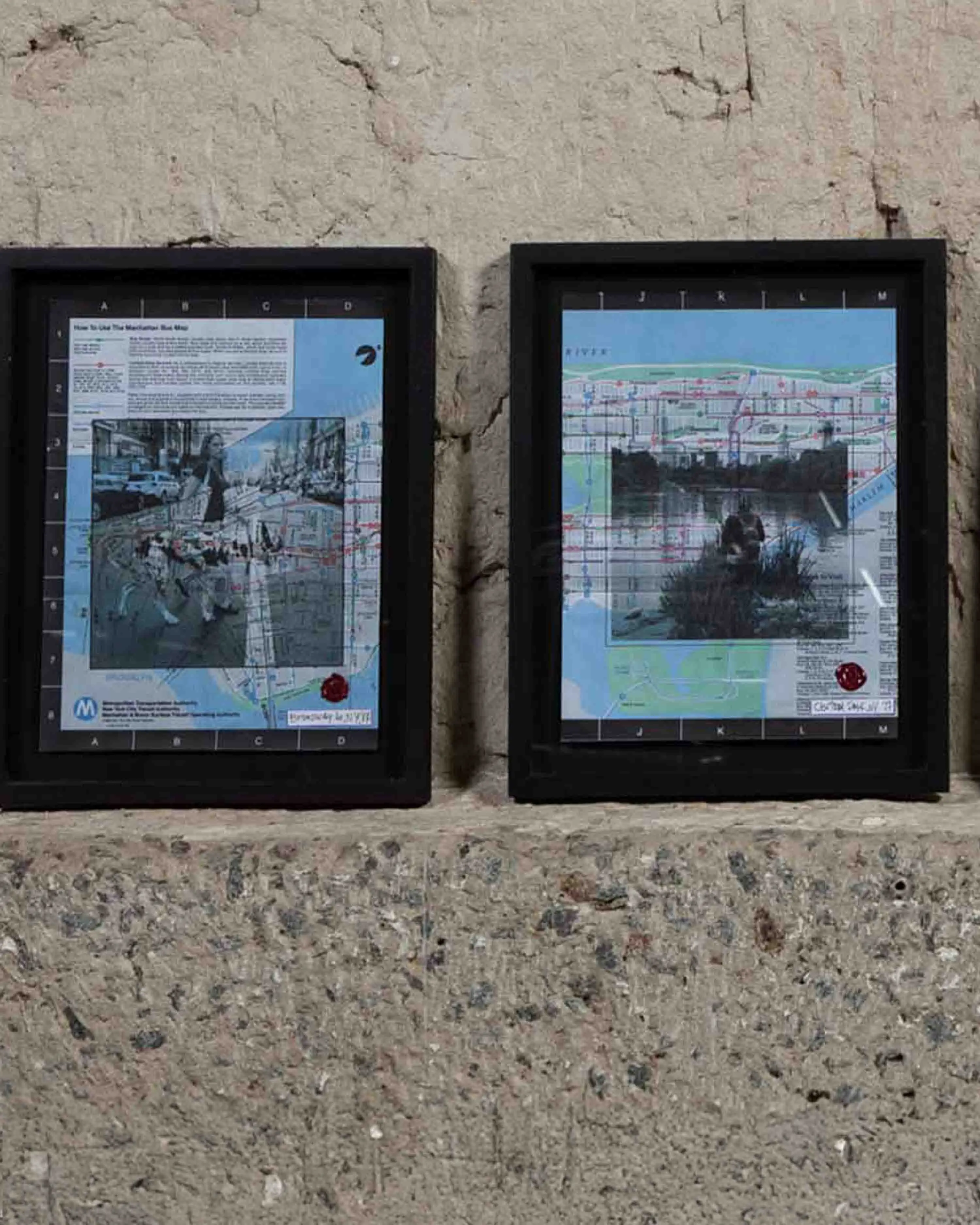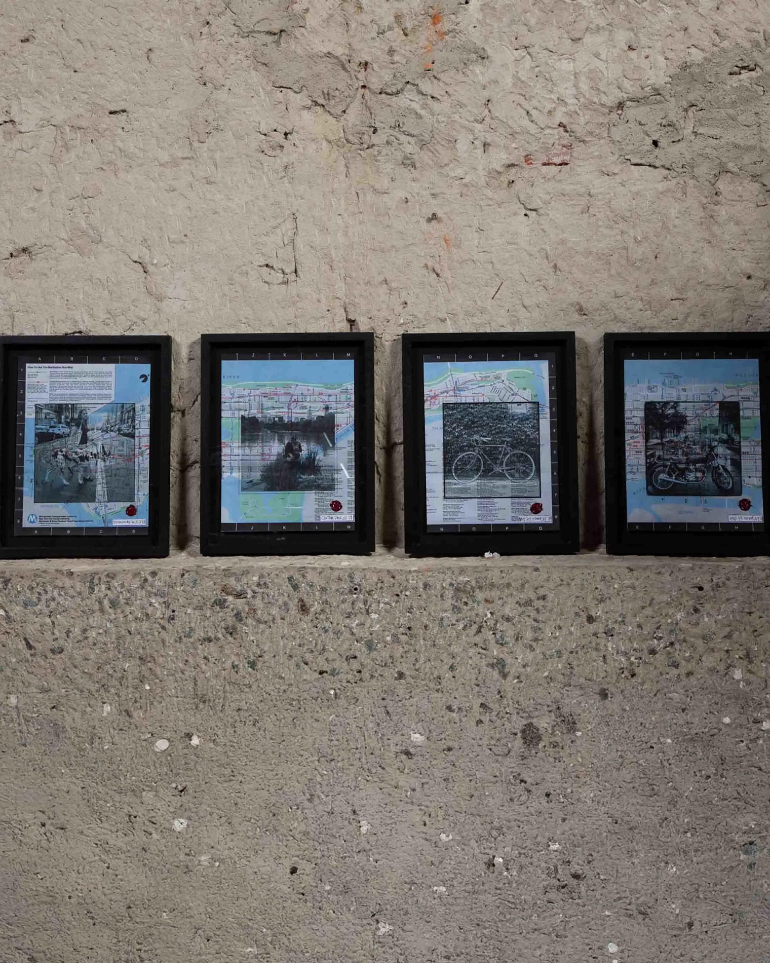 Serie de 4 collages de fotografías impresas sobre el Manhattan Bus Map de 1989.
