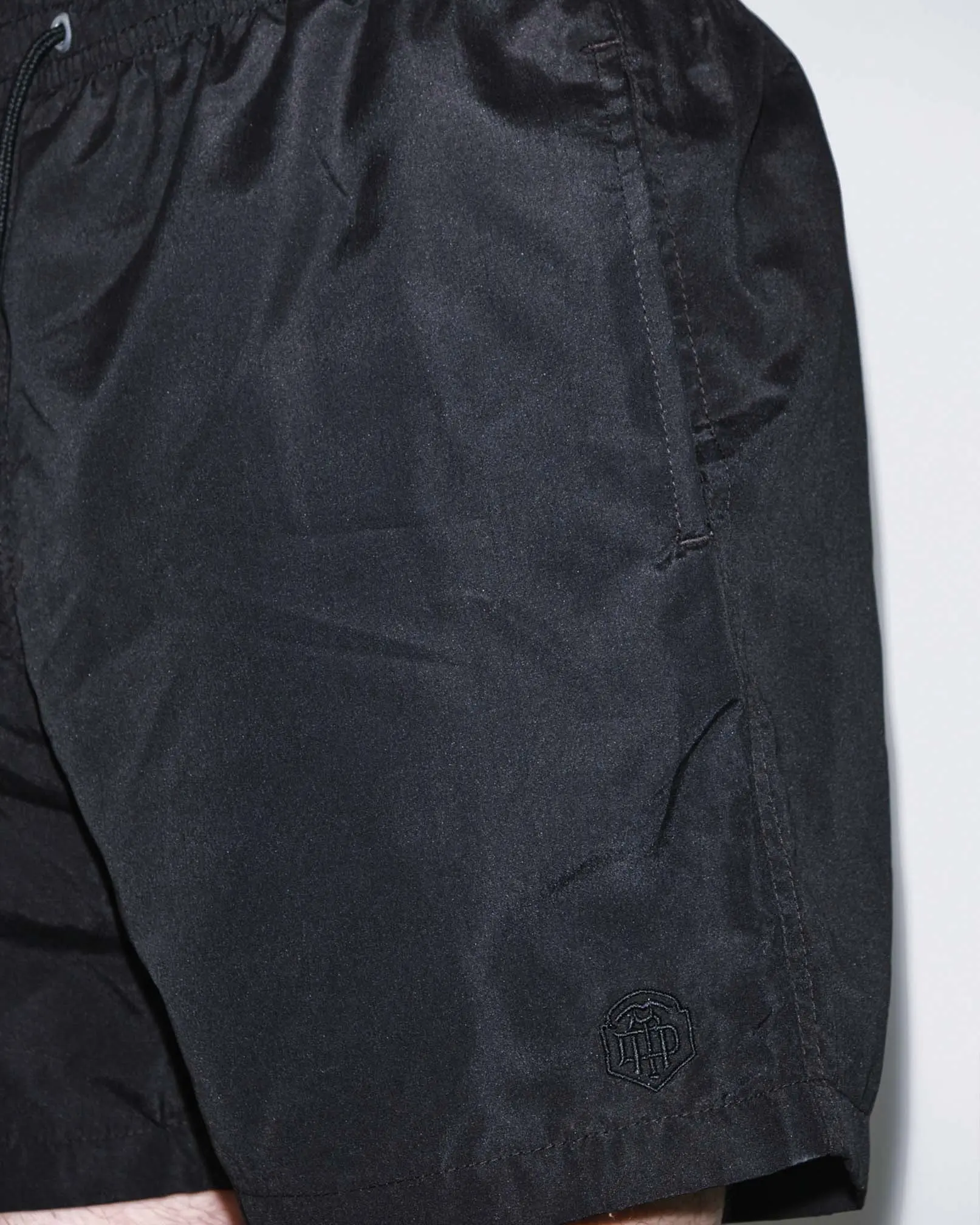 Short de baño confeccionado en microfibra, con interno de red. Cintura ajustable con elástico interno y cordón con puntera. Logo de marca bordado al frente en hilo negro.